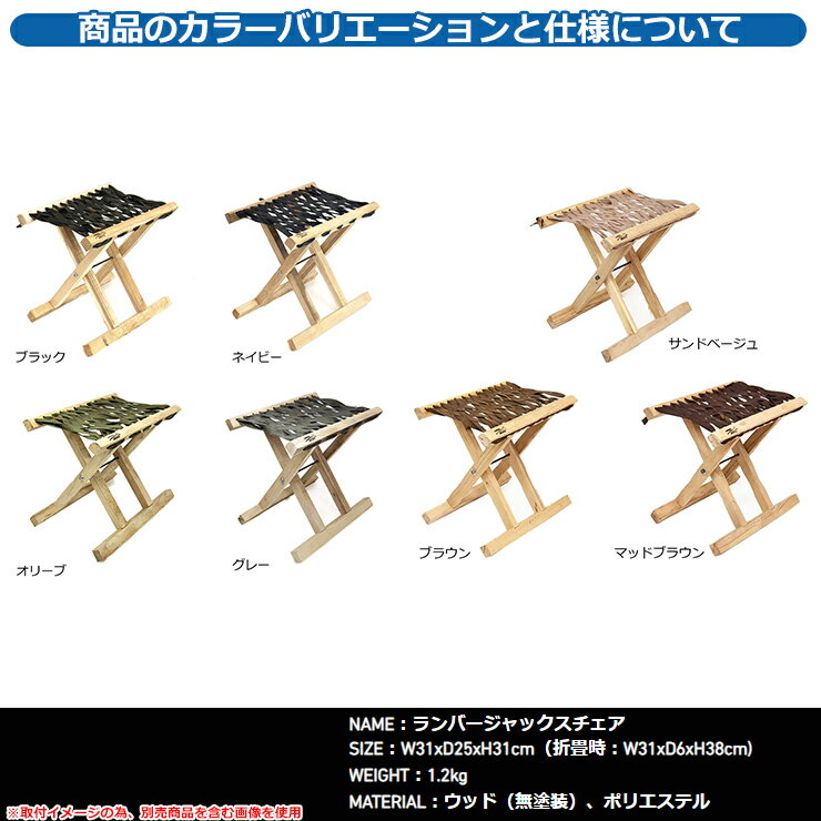 販売条件 ◆詳しくはこちらをご確認ください カラー ・ブラック ・ネイビー ・グレー ・オリーブ ・サンドベージュ ・ブラウン ・マッドブラウン サイズ SIZE:W31xD25xH31cm(折畳時:W31xD6xH38cm) WEIGHT:1.2kg 素材 ウッド(無塗装)、ポリエステル 仕様 折り畳みチェア セット内容 ■ランバージャックスチェア ※ご購入時に選択いただいたお色の商品1点をお送りいたします。