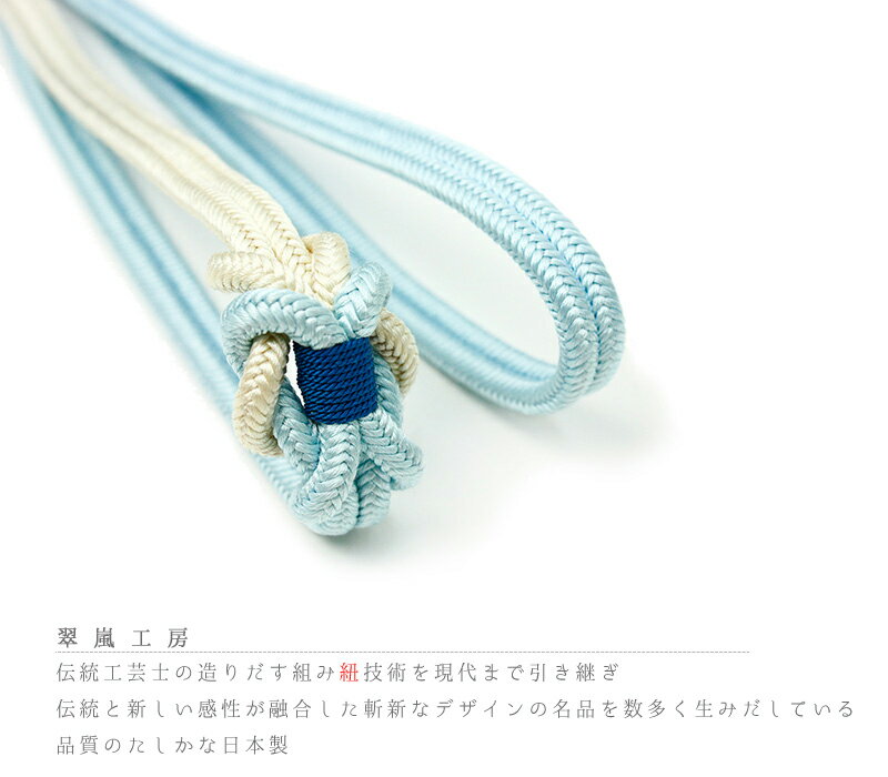 帯締め 三分紐 京組紐 翠嵐工房 洋角水引引掛け巻 正絹 日本製 変わり結び 水色 ベージュ 青 スカイブルー 生成り カジュアル 洒落着用 ツートンカラー ポップ 派手 シック クール かっこいい かわいい 粋 食事会 シック 締めやすい 締まる 帯留め 和装 着物 No.10-0955